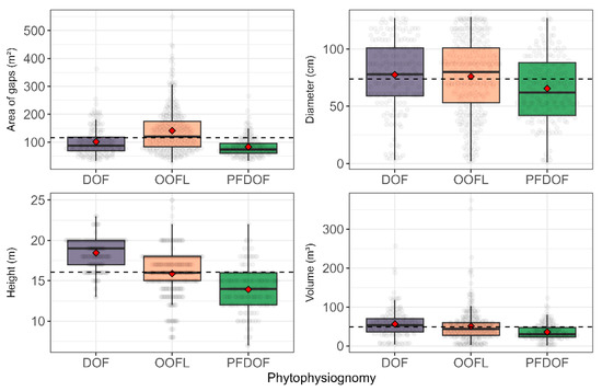 Box plot for the area of gaps (dependent variable) and the dendrometric variables measured in the felled trees, arranged by phytophysiognomy. Vertical bars (black color): Q1 − 1.5 × IQR (1st quartile minus 1.5 times the interquartile range) and Q3 + 1.5 × IQR (3rd quartile plus 1.5 times the interquartile range); red points: arithmetic mean of the variables of each phytophysiognomies; horizontal dashed lines (black color) in each sub-\figure: arithmetic mean of the variable in the sample. PFDOF: periodically flooded dense ombrophilous forest; DOF: dense ombrophilous forest; OOFL: open ombrophilous forest with lianas.