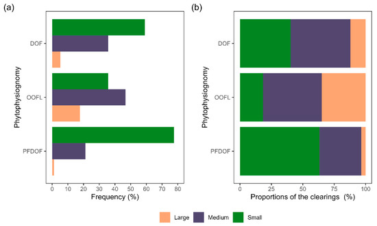 Of the sampled clearings, 342 were classified as small, 244 as medium, and 67 as large. In relative terms, felled trees generated a higher proportion of medium (n = 148; 46.7%) and large (n = 56; 17.7%) clearings in the OOFLs than in the other forest types. The medium and large clearings represented 46.7% (20,900 m2) and 34.9% (15,622 m2), respectively, of the total area opened by the felled trees. The highest proportions of small clearings were found in DOF (n = 101; 59.1%) and PFDOF (n = 128; 77.6%) phytophysiognomies. Thus, small clearings were 40.4% (7002 m2) of the open area in DOFs and 63.3% (8653 m2) in PFDOFs (Figure 3).