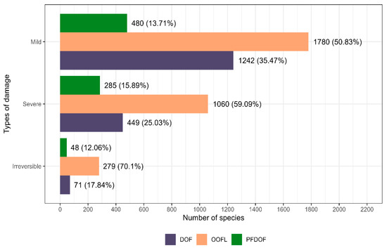 OOFLs showed the highest number and percentage of damaged trees in the three categories (mild, severe, and irreversible), followed by DOFs and PFDOFs (Figure 4).