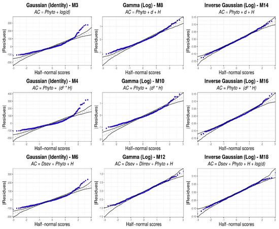 The original dataset (n = 653) was divided into training (80%) and test (20%) data through random stratified sampling based on the diameters of the trees whose extraction gave rise to the clearings. We used the training dataset to estimate the parameters of the GLMs, and the power of generalization was assessed using the test set. The fitting quality of the GLMs was assessed by inspecting the residual deviance of the Akaike information criterion (AIC) [28] (Equation (2)), the Bayesian information criterion (BIC) [29] (Equation (3)), relative root mean square error (rRMSE) (Equation (4)), and through diagnosis of half-normal plots with simulated envelopes. The fulfillment of the hypothesis of absence of collinearity (or multicollinearity) was assessed using the variance inflation factor (VIF) statistic (Equation (5)). Severe effects of multicollinearity were assumed when VIF > 5 [30]. Potential outliers and influential points were diagnosed by analyzing a Cook’s distance chart. Following this, some models were refitted by removing individual observations and evaluating the impacts of these modifications on the estimates of coefficients and standard errors.