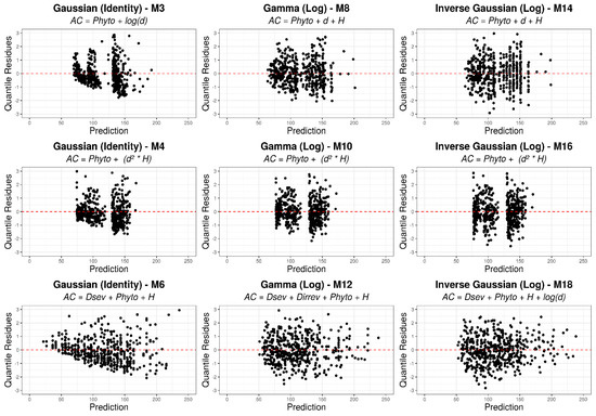 Most of the calibrated models are unreliable for making inferences since they had nonsignificant regression coefficients (α = 0.05; t-test). Severe multicollinearity effects (VIF > 5) were identified in the coefficient estimates of the fitted models that included the inverse Gaussian (logarithmic link) distribution and also for the models M5 (Gaussian and identity link) and M11 (gamma and logarithmic link), which include the predictors ln(d) and ln(d2H). The M12 model (gamma and logarithmic link), with the inclusion of predictors indicative of the amount and intensity of damage caused by falling trees on remaining trees, fitted the data better and showed better predictive performance. In this case, predictors indicative of the amount of irreversible or severe damage to trees were more important in describing the effects on the response variable. For the M12 model, the half-normal plots showed residuals inside the simulated envelope, indicating a good fit of the model to the data (solid black lines, Figure 5). In addition, the randomized quantile residuals showed good adherence to the Gaussian distribution (Figure 6), confirmed by the Shapiro–Wilk hypothesis test, without discrepant values, which were in the range of −3 to 3.
