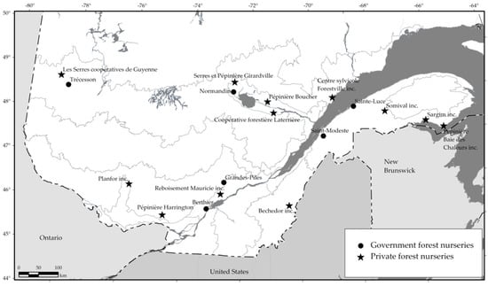 Locations of private and government forest nurseries in the province of Québec (adapted from Lamhamedi et al. []).