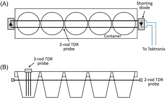 Schematic of the linear five-cavity container (aerial (A) and lateral (B) views) including a 10.5 cm long three-rod TDR probe inserted vertically within a cavity and a 36 cm long two-rod TDR probe with shorting diodes inserted horizontally across the five cavities at a height of 8 cm from the bottom of the container.