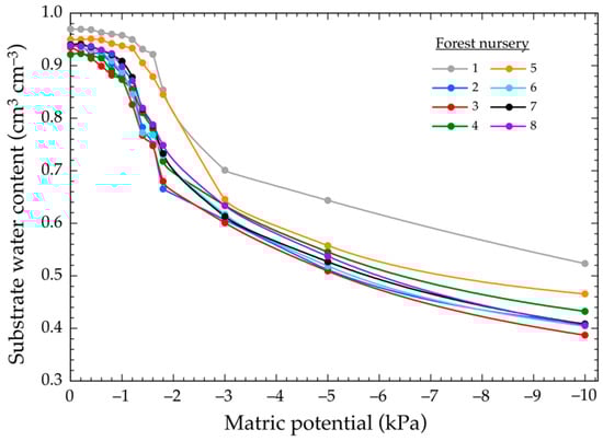 Total porosity values for sampled substrates were similar to those reported in the literature for blond and brown fibric peat [,,,,]. Moreover, substrates from the eight forest nurseries showed desorption curves similar to those observed in other studies [,]. Overall, the available and easily available water content varied little among substrates (Table 2). This is not surprising, as the volumetric water content at −5 and −10 kPa were similar, except for the substrate from nursery 1, which had a generally higher water content (Figure 4). Bernier and Gonzalez [] observed a positive correlation between root dry mass and easily available water. However, this relationship was not observed in the present study, which may be due to irrigation management and environmental conditions between nurseries.