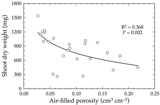Relationship between shoot dry weight of white spruce seedlings (1+0) and the air-filled porosity at container capacity of substrates at the end of the growing season (n = 24).