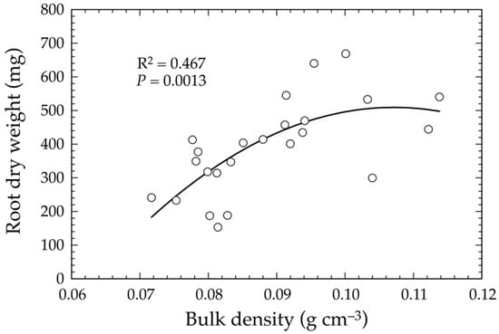 Relationship between root dry weight of white spruce seedlings (1+0) and bulk density of substrates at the end of the growing season (n = 24).