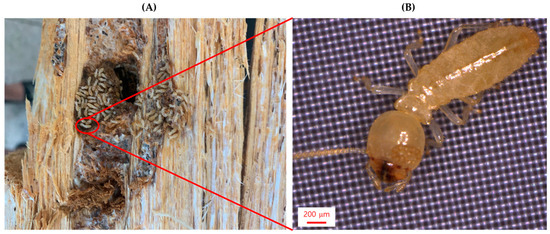 Termites have a wide range of ecological distributions, ranging from the tropics, arid and savanna vegetation, oceanic islands, and mangroves, to temperate regions, with higher diversity and abundance in the rainforests of Africa, South America, and Southeast Asia [8,9,10]. Despite their role in nutrient cycling through organic matter decomposition, termites are widely categorized as pests of live wood in tree trunks and wooden structures such as houses and cultural heritage sites [2,11,12]. Moreover, with the increasing changes in the global climate and substrate distribution, some termite species have invaded new ecological regions where they cause tremendous damage to wooden structures, forest trees, and crops [2,9,13]. Termites cause an estimated economic loss of approximately USD 40 billion globally per year, with a continuous increase in the scale of damage due to global warming [14,15,16,17]. They mainly move through underground tunnels to enter wooden buildings through the lower part of columns, attacking the inside of the wood in a concentric circle, which damages the original shape and destabilizes the structure of wooden buildings [2,14,18]. In the Republic of Korea, a number of subterranean termite species are known to cause substantial economic damage in agricultural/ornamental crops, live forest trees, especially Pinus densiflora Siebold and Zucc. (Pinales: Pinaceae), and wooden structures of cultural heritage [19,20]. The worker caste of Reticulitermes speratus kyushuensis Morimoto (Isoptera: Rhinotermitidae) is responsible for causing the most severe damage in the trunks of live trees and wooden structures, as observed in the live P. densiflora log (Figure 1).