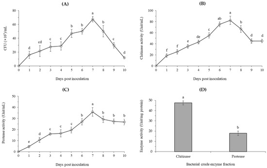The viable cell count (A), chitinase enzyme activity (B), protease enzyme activity (C), and crude enzyme activity of B. licheniformis PR2 (D). The bacterial culture was grown in PB medium at 30 °C for 10 days. The bacterial culture for crude enzyme preparation was grown for 7 days. All points represent mean ± standard deviation (n = 3). Different superscript letters in a figure indicate that values are significantly different (p = 0.01).