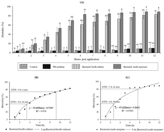 The mortality rate of R. speratus worker termites in the control group, PB medium, bacterial broth culture, and bacterial crude enzymes from B. licheniformis PR2 under laboratory conditions (A). Regression curves illustrating the median lethal time (ET50) and the time required to attain 90% of the maximum response (ET90), for the bacterial broth culture (B), and crude enzyme fraction (C). The bars represent mean ± standard deviation (n = 3). Different superscript letters a–n in the figure indicate that values are significantly different (p = 0.01).