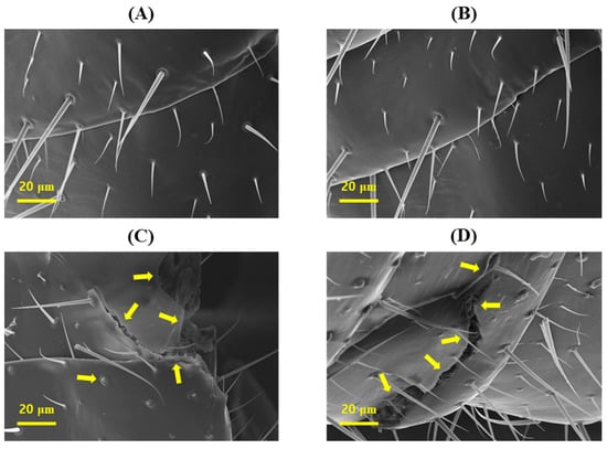 The scanning electron micrographs indicating the morphological characteristics in the cuticles of R. speratus worker termites in the different treatment groups; control (A), PB medium (B), bacterial broth culture (C), and bacterial crude enzymes (D) from B. licheniformis PR2 under laboratory conditions. The yellow arrows indicate cuticle deformations such as rupturing, swollen socket and broken setae due to treatment application.