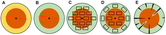 Material testing requires a homogenous matrix [5], while the presence of zones and gradients are typical characteristics of wood products. Therefore, such products need to be sampled in a representative manner, which can hardly be achieved without knowledge about the outdoor performance of the entire product. Furthermore, the latter is affected by the environmental conditions; the risk of weathering and leaching; and the type, retention, and distribution of the preservative itself [12,13,14,15,16,17]. The challenge of taking representative samples from wood products can be described using the example of preservative-treated utility poles made from pine wood (Pinus spp.). Pine roundwood can be divided into at least two zones, the outer non-durable sapwood and the inner heartwood (Figure 1A), which ranges from less durable to durable [18]. The distribution of biological durability within the pole is reversed after a pressure treatment with a wood preservative (Figure 1B). While the outer sapwood is supposed to be very durable, the durability of the heartwood is not changed by the impregnation due to its low permeability and preservative uptake. In principle, there are only two options for taking samples from a treated pole, i.e., (1) random sampling (Figure 1C) or (2) zone-wise sampling (Figure 1D). However, both options cannot reflect the actual exposure of the pole in contact with soil (Figure 1E), where the most critical hazards can be expected from the outer mantle of the pole, which is in direct contact with the soil and the micro-organisms in it. Furthermore, the pole is subject to various abiotic agents before and during exposure. Drying checks can occur before and after the treatment and can serve as entry port for moisture and decay organisms [19,20]. On the other hand, the outer, more durable zone of the pole forms a shell that is supposed to provide protection to the inner core as long as it is intact. The complexity of the latter makes any sampling guaranteed to fail. Keeping the basic configuration of a wood product during the test seems to allow a realistic assessment of its durability.