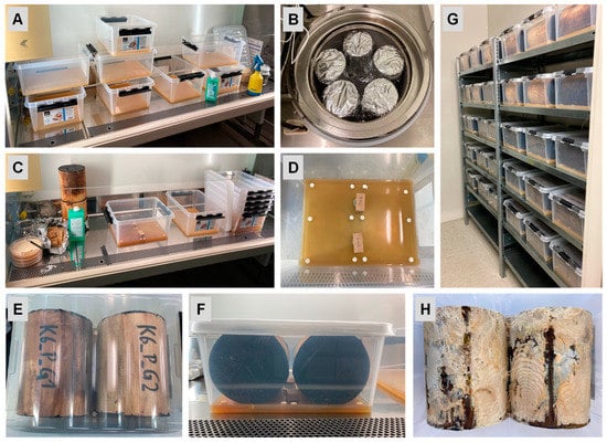 Preparation and incubation of palisade specimens. (A) Handling of incubation containers filled with malt agar. (B) Sterilization of palisade sections in an autoclave. (C,D) Inoculation and placement of virulence control specimens. (E) Top view of palisade specimens. (F) Sideview of palisade specimens. (G) Incubation containers in a conditioned room. (H) Mycelial growth on palisade specimens.