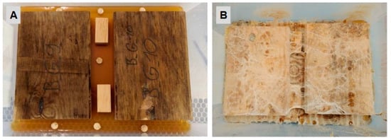 The specimens were incubated in plastic containers (170 × 270 × 235 mm3, H × W × D) filled with 850 mL malt agar (4%) and closed with a lid (Figure 2A–G). The incubation time was 16 weeks. Each container comprised two test specimens and two virulence control specimens (15 × 25 × 50 mm3) either made from untreated Scots pine sapwood or beech (Fagus sylvatica) for brown rot and white rot fungi, respectively (Figure 2F). Twelve inocula were placed on the malt agar, as shown in Figure 2D. During incubation, the containers’ lids were additionally sealed with a stretchable closure tape (Parafilm M, Pechiney Plastic Packaging, Chicago, IL, USA).