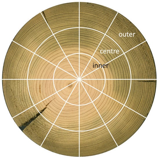 Terrace decking boards (27 × 140 × 3000 mm3) and palisades (Ø 160 mm, 3000 mm long), both made from Scots pine (Pinus sylvestris), were investigated, as summarized in Table 1. Therefore, the different products were partly impregnated in full size with a commercial water-borne copper-based wood preservative. Before impregnation, the decking boards and half of the palisades had a wood moisture content (MC) below cell wall saturation (approx. 30%, e.g., [14]) and were thus ‘ready to impregnate’. The other half of the palisades had been submerged in a basin for two weeks to increase the MC well above cell wall saturation in order to create a test material of lower treatment quality. The impregnation treatment was conducted in an industrial treatment plant at Fürstenberg-THP GmbH, Hüfingen, Germany. The process consisted of a pre-vacuum (≥150 min pre-vacuum at <25 mbar) and a pressure phase (min. 480 min at >9 bar). The solution uptake and the preservative retention were based on the preservative manufacturer’s recommendations and determined by weighing the palisades and decking boards to the nearest 100 g and 10 g, respectively, before and after impregnation. Data for both measures are summarized in Table 1.