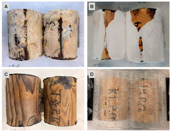 Similar to the palisade specimens, the majority of decking board specimens showed clear signs of decay after 16 weeks of incubation with C. puteana, but different infestation pathways did not become evident, since all specimens contained both sapwood and heartwood sections (Figure 8A,B,D). Only the treated, non-dried, and end-grain-sealed specimens were free from decay (Table 4, Figure 8C). All untreated specimens were infested, and 90%–100% of the treated and subsequently oven-dried specimens showed signs of decay as well. It became evident that oven-drying had a positive effect on the progress of fungal decay, which might be the consequence of the occurrence of drying checks, but the latter could not be clearly identified at the end of the incubation experiments. In contrast, end-grain sealing had a negative effect on the progress of fungal decay, which is most likely the effect of blocking the axial pathways in wood, which are preferred not only by liquid water, but also by decay organisms such as fungi [29,30]). As previously shown for the palisades, the maximum Adecay was scattered less than the mean Adecay (Table 4).