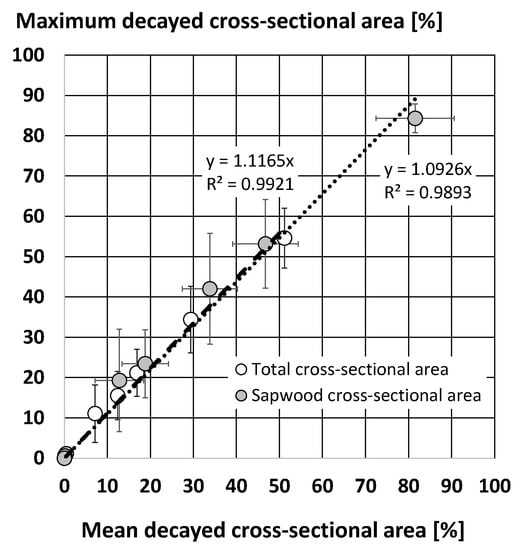 As expected, the decayed cross-sectional area Pdecay% varied significantly (i.e., coefficients of variation between 15 and >500%, Table 3). However, the variation of the mean Pdecay% was generally more prominent compared to its maximum (by a factor of 1.1 to 2.4, see Table 3 and Figure 6), which again speaks in favor of using the latter. In addition, the mean and the maximum decayed cross-sectional areas were well correlated (Figure 6) for both the total and the sapwood cross-sections. To provide agreement with existing field test standards, such as EN 252 [21] and EN 12037 [22], the maximum value has been given preference.