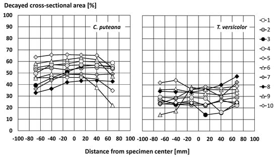 Apparently, the decayed cross-sectional area varied partly in terms of the specimens’ length, but such variations did not follow a clear rule, as seen in C. puteana and T. versicolor in Figure 7. For assessing both the mean and the maximum decayed cross-sectional areas, sampling should be carried out along the entire specimen length. In general, the number of studies using different decay assessment methods in comparison is scarce [24]. However, some comparative studies included a visual evaluation of cross sectional specimen areas [24,25,26] and concluded that weak points could be detected more easily compared to mass loss, mechanical loss, or schematized indentation measurements. Similar observations were made when examining decay in standing trees [27,28].