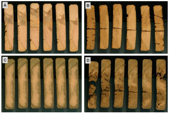 Sections of decayed decking board specimens after 16 weeks of incubation with C. puteana. (A) Untreated control, not oven-dried, end-grain sealed. (B) Untreated control, oven-dried, not end-grain sealed. (C) HQ treated, not oven-dried, end-grain sealed. (D) HQ-treated, oven-dried, not end-grain sealed.