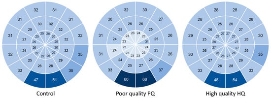 The wood MC within the palisade specimens varied throughout their cross-sections after 16 weeks of incubation, as illustrated exemplarily for C. puteana and both treatment qualities in Figure 9. The highest MC (i.e., 35%–68%) was observed at the bottom part of the specimens, which had been in direct contact with the malt agar. This part of the specimens was not decayed, not even within the untreated control specimens, which might be attributed to unfavorably high moisture content or the presence of malt agar. However, the MC range found in this specimen region did not exceed the physiological cardinal points of C. puteana [30,31,32]. In contrast, the adjacent area above the ‘malt–agar line’ showed the most severe decay (Figure 10). The remaining parts of the specimens had MCs of between approx. 22 and 45%, but all specimens contained sections where the moisture conditions were favorable for fungal decay [32,33].