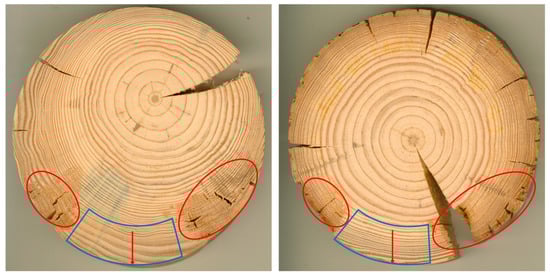 Sections of decayed control specimens after incubation with R. placenta (left) and C. puteana (right). Red arrows: points of support; blue areas: decay-free zones; red ovals: areas with severe decay.