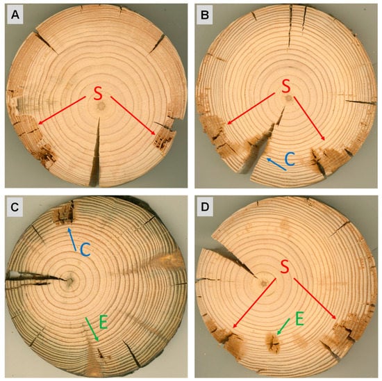 Sections of decayed test specimens. (A). Control specimen, decay by G. trabeum, starting from the sapwood (S). (B) Control specimen, decay by R. placenta, starting from sapwood and a large crack (C). (C) LQ-treated specimens, decay by C. puteana, starting from a crack and the end-grain (E). (D) Control specimen, decay by R. placenta, starting from sapwood and end-grain.
