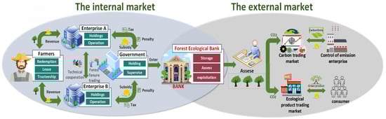 The local government, as the leading party, has established a mostly government-owned ecological bank “platform” around the idea of trading natural resource indicators. This is the core component of the internal trading market involving relevant enterprises. The internal market consists of two types of supply and demand transactions. First, the “platform” acts as the demand side, acquiring the management and use rights of forest resources according to the national standard price. Meanwhile, the farmers sell the management and use rights of forest resources through redemption, lease, trusteeship, and shareholding to obtain economic benefits. Second, enterprises of different scales trade the forest resources that are difficult to develop or those that are unexplored. In the whole process, the government, as the controlling party of the “platform”, performs a supervisory function, incentivizes enterprises to participate in the FEB “platform” by giving subsidies and penalties, and expands that “platform”.