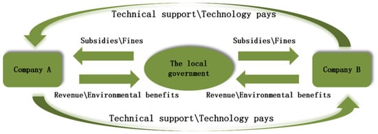 Therefore, this study applies the evolutionary game approach to mimic the game among subjects. This study also argues that the realization of the final evolutionary stable strategy by individuals through imitation, trial, and error is the result of those individuals’ repeated imitation, trial, and error. Therefore, this paper illustrates the game relationship between local governments and two companies of different sizes; importantly, both have forest resource development as their main business. The game relationship is used to study the impact of government strategies on the promotion of FEB policies, and the game relationship is as follows in Figure 2.