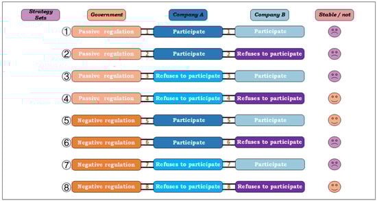 Thus, the three subjects involved in the game are the local government, firm A, and firm B. The government, as the regulator, has two regulatory strategies: active regulation and negative regulation. Companies A and B are in the same industry and have two behavioral strategies: participating or refusing to participate in the FEB policy. Here, a circular diagram is used to represent the eight scenarios of the whole game system. Each of the eight closed loops represents a different combination of the three subjects’ strategies, i.e., the set of eight strategies, as shown in Figure 3.