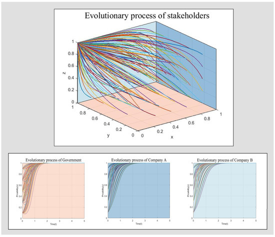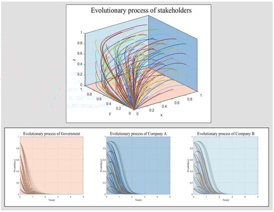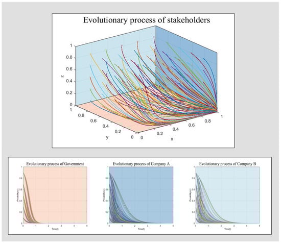 Here, F1 (0, 0, 0) is the only ESS when (1 − θ) (PA + PB − EGAB) + 2θCG2 < CG1, QA > SA + VA + θPA + m and QB > SB + VB + θPB + n. To satisfy this requirement, the parameters are set as shown in Table 4. As shown in the results presented in Figure 4, the three different colors represent the cross-sectional plots according to the x, y, and z axes, indicating the trend of strategy evolution for the government, firm A, and firm B, respectively, with different initial probabilities. By observing the convergence of each curve in each cross-sectional plot, it is clear that, along with each iteration, the probability of each stakeholder choosing a strategy (x, y, z) increases continuously and finally converges at F1 (0, 0, 0). Combined with Table 3, the results show that under the stability condition, regardless of the initial probability, the government and the company assess the implementation risk and tend to make a policy choice that is contrary to the implementation. Thus, in the face of the risk of eventual economic loss due to policy implementation failure, firms will ultimately choose a “no participation” strategy, independent of their initial probability. At the same time, active government regulation puts more financial pressure on firms, and they are more likely to choose “negative” policies. Figure 4 shows that the initial probability does not affect the final stabilization outcome.