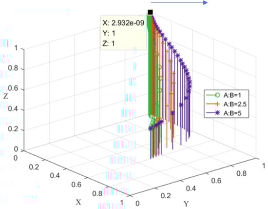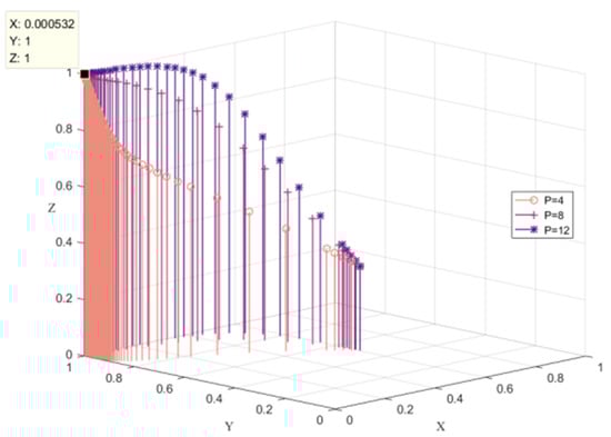 Here, F4 (0, 1, 1) is the only ESS when QA < SA + VA + θPA + m and QB < SB + VB + θPB + n. To satisfy this requirement, the parameters are set as shown in Table 5. By observing the convergence of the curves in the cross-sectional plot according to the x, y, and z axes, the simulation results in Figure 5 show that both companies of the same size and the government will adopt a specific strategy (x, y, z), which eventually stabilizes at F4 (0, 1, 1) as the iteration continues. When the expected additional cost of a firm’s “opt-in” strategy is less than the benefit of policy participation, i.e., the risk of loss is smaller, the firm will choose the “active participation” strategy, regardless of the initial probability. Figure 5 shows that participation of media monitoring shares the cost of government regulation, so the government tends to choose the “negative regulation” strategy. Therefore, the involvement of media monitoring is an important factor that influences the policy to achieve the desired policy implementation state.