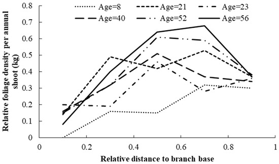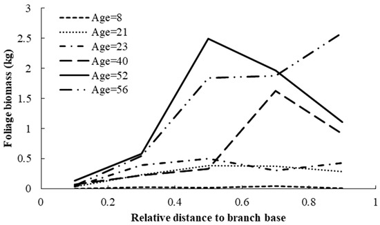 3.2. Foliage Biomass Distribution at the Annual Shoot Level