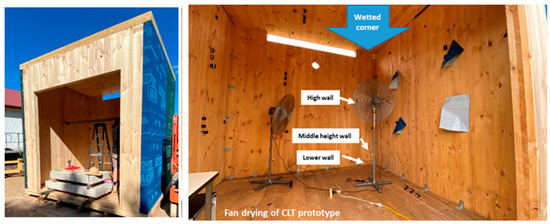 CLT structure used for the moisture monitoring study (left) the structure at the time of testing, (right) the area of moisture application and sections of moisture probing (high, middle height and lower wall) for MC observation during fan drying.