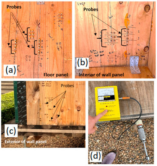 CLT prototype moisture meter probes and fan drying set-up, on (a) floor panel, (b) interior of wall panel, (c) exterior of wall panel and (d) moisture meter used for moisture content readings.