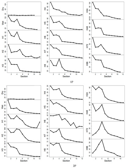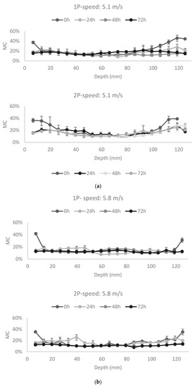 Figure 11 shows the data collected during the fan drying experiment using moisture probes on the end and edge sections of the panels at different depths. The changes in moisture content of the surface and depth of 1P and 2P sections show the faster drying of surface sections in 1P samples than in 2P samples. There was moisture content higher than 20% in 2P sections after 72 h of drying.