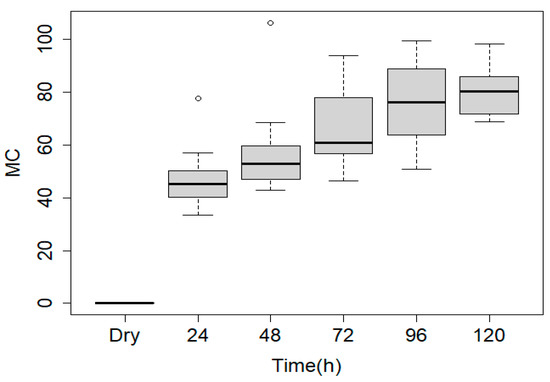 After the saturation period of 120 h, samples were removed from the water and then placed in a drying oven at 103 °C until they reached moisture equilibrium to determine the overall sample moisture content according to AS/NZS 1080.1 [30] Timber. The MC percentage was calculated using the oven-dried method (according to AS/NZS 1080.1) as follows: