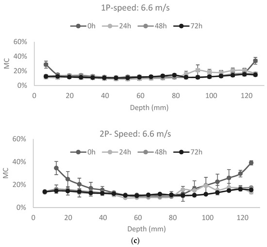 Figure 8 shows the MC of core sections taken from submerged panels after they were removed from the water and during fan drying (0–72 h). Submerged samples in the water had moisture content higher than FSP for both 1P and 2P cores on the panel’s face (Figure 8a–c), average MC recorded were 42% and 35% for 1P and 2P cores on the panel surface, respectively, after 72 h of drying. Industrial fans were used for the fan drying trial with three fan speed settings. The fan speeds tested were very close to each other; however, from the MC values determined, the MC was higher than 20% after 72 h of drying for the lowest fan speed tested.