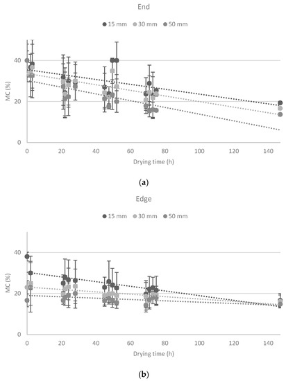 The average moisture content of CLT edge and end sections recorded using a moisture meter during fan drying (a) end and (b) edge.