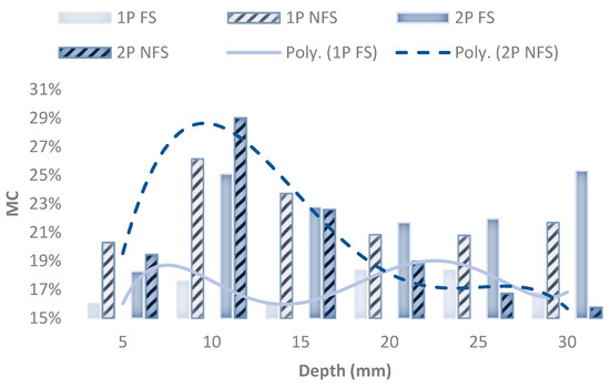 ANOVA of the overall drying data set showed that both depths of reading and drying duration had significant effects on the determined MC (Table 3). Indicating the MC of the panel varies between both the 1P and 2P sections due to the various observations presented above. The significant difference between drying rate supports the discussion that 2P sections (the unbonded edge gaps) provide a means for moisture ingress to occur deeper for these CLT panels.