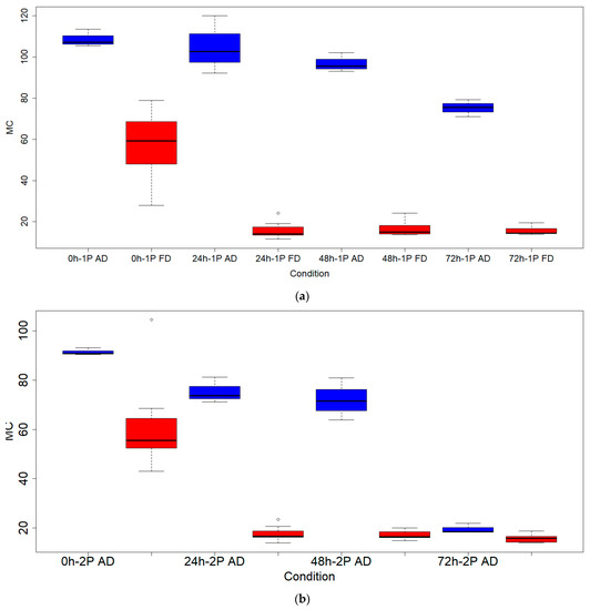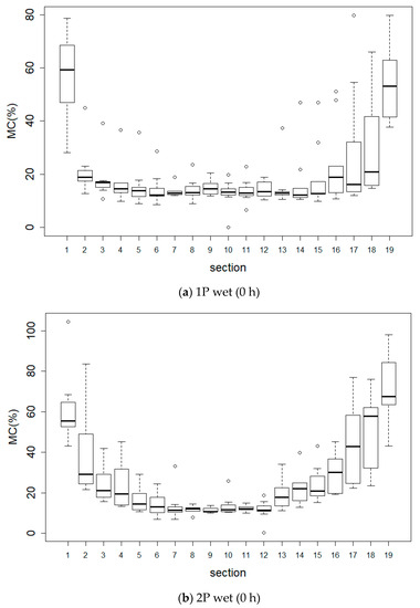 Comparison between the average moisture content of sections in wet conditions (0 h) and after 72 h of fan drying, each box plot shows the average value for a subsection.