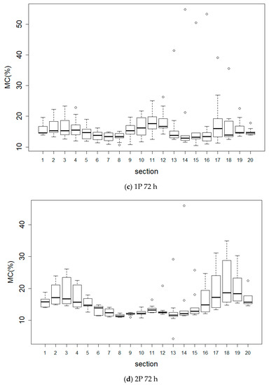Figure 12 shows a summary of the average MC for 1P and 2P core sections during fan drying at 0 h (wet condition) and after 72 h of fan drying. The differences between the CLT sections facing the fan and the back sections were monitored by comparing MC values for the extracted cores and MC probing results. The core sections taken at 0 h of drying (after soaking concluded) showed higher moisture content in the 2P section, indicating that the edge gap contributed to accelerated moisture gain. Moisture accumulation above 20% was observed in the cores’ depth after 72 h of fan drying. The average moisture content of wet cores was 22.62 ± 16% and 25.71 ± 17% for 1P and 2P sections, respectively. The high variation in average MC shows the differences in moisture uptake in the outer and inner sections of the panels.