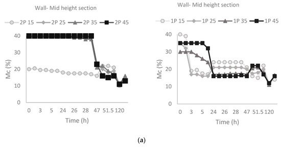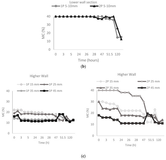 Moisture content determined for drying wall panels (a) in direct front of the fan, (b) lower wall and (c) higher wall sections away from fan drying.