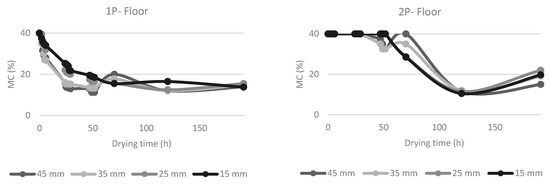 Figure 9 presents the moisture change as measured by the resistive meter over the drying time for the three depths of the meter probes. As mentioned in the methodology, for moisture monitoring using fan drying trials, both coring and probing were used for recording MC values. The moisture meter used for measurements had limitations in measuring moisture content above 40%; therefore, a ceiling level of 40% was shown, although it should be noted that the actual MC value could be in fact higher than this. The low accuracy of readings at higher moisture content (>26%) has been reported previously [34]. The moisture meter data summary for the edge sections (sections of the panel with end grain exposed to moisture) of panels showed elevated moisture content (above 20%) in 15- and 30-mm depth (Figure 10) at 24 h of drying. For the end sections of the panel, the moisture content was above 20% for the 15-, 30- and 50-mm depths of the panel (Figure 9).