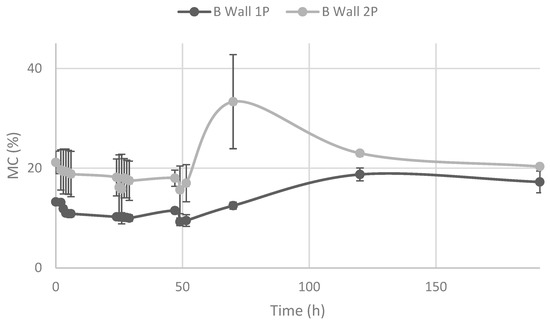 Compared to the results of the ambient drying presented (Figure 7), the measured MC falls below or at about the target 20% MC level after 72 h and thus the coring was stopped at this point. Due to the ease of rapid assessment, probing with a moisture meter was continued for 120 h. The ambient drying results showed that the moisture content values were still above 80% 48 h after the process began, while fan drying resulted in quicker removal of moisture from the structure.