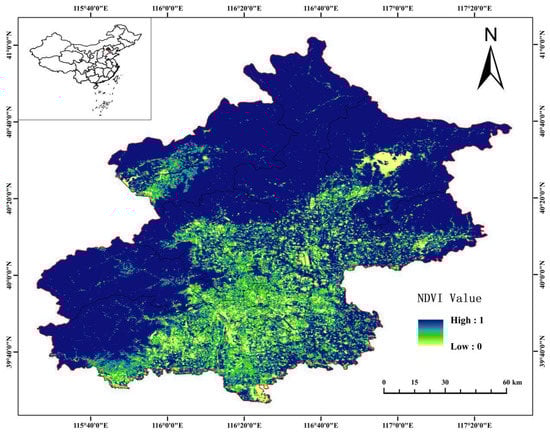 Beijing is an important economic center and population agglomeration area in China, and the health status of forest ecosystems has a significant impact on the lives of residents and economic development. It is located on the northwestern edge of the North China Plain (115°25′~117°30′ E, 39°28′~41°05′ N), with its center at 116°25′29″ E and 39°54′20″ N. Beijing’s topography is mainly composed of the Zhongshan Mountains, Yan Mountains, and Taihang Mountains, gradually rising from northwest to southeast. The highest peak is Badaling with an elevation of 2303 m. The city’s main rivers include the Bohai, Baihe, Yongding, and Nanyunhe, which form the three major natural zones of “Western Mountains, Northern Plains, and Eastern Waters”. Beijing belongs to a warm temperate semi-humid and semi-arid monsoon climate zone, with distinct seasons. Spring is mild, summer is hot and rainy, autumn is cool and pleasant, and winter is cold and dry. The average annual temperature is around 12 °C, and the annual precipitation is 600–700 mm. Due to differences in elevation, the climate factors, such as temperature and precipitation, also vary within the city. In addition, the vegetation coverage in different areas of the city varies. The vegetation growth and spatial distribution in Beijing are shown in Figure 1.