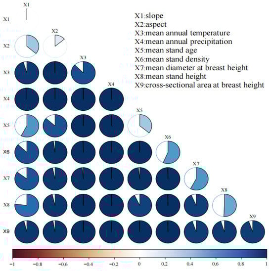 The stand factors, site conditions, and meteorological factors are all important factors affecting forest biomass, and the influence of each factor on forest biomass varies depending on the region, environment, vegetation type, and other conditions [,,,,,,]. According to extensive research, this study selected forest stand factors (mean stand age, mean stand density, mean diameter at breast height, mean stand height, and mean cross-sectional area at breast height), site conditions (slope, and aspect), and meteorological factors (mean annual precipitation, and mean annual temperature) as variables. This study used Geographic Detector to analyze the correlation among variable factors and plotted the following factor interaction diagram using the R software environment (Figure 3). It can be seen that the impact of any two independent factors was enhanced after interaction. However, the correlation between terrain factors, such as slope and forest growth, was weak, while the correlation between meteorological factors was strong. The main reason is that the impact of terrain factors on forest growth can ultimately be reflected in temperature and precipitation [,,,].