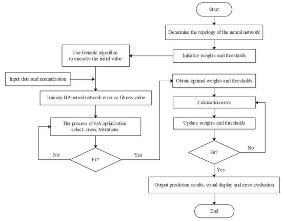 In this study, we used a single hidden layer to construct the model. The sorted data were randomly divided into test sets and training sets, while the input and output vectors were normalized to a range of [0, 1] using the Max and Min method. The topological structure of BP-ANN was determined to be 9-14-1, and the empirical range of weight and threshold value was [−1, 1], so that the range of optimization can be widened appropriately. The number of learning iterations was set to 1000, with a minimum training target error of 0.00001 and a learning rate of 0.1. To improve the learning ability of BP-ANN, the algorithm was optimized. To pass in front of the signal process, it imports data from the input layer, constantly training the model in the hidden layer, and then reaches the output layer; if the output of and comparison between the predicted values and the real value if it do not meet expectations, it goes into the reverse transmission, and uninterruptedly adjusts the weights and thresholds, until the minimum error output value is close to the real value. Finally, the prediction results are inversely normalized and visualized, while the model error evaluation is given as the output (Figure 4).