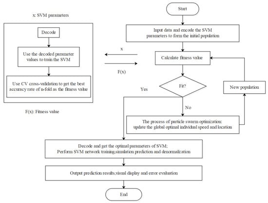This study was carried out using the libsvm toolbox. According to the requirements of the SVM model, the input and output vectors were normalized, and the encapsulated svmrp was used to predict the number growth of svm, and the optimal parameters C (penalty parameter) and G (kernel parameter) were found. In order to improve the learning ability of the SVM network, the particle swarm optimization algorithm was used for parameter optimization, whereby the penalty parameter C and kernel parameter G were used as optimization variables with cross-validation. The initial range of the penalty parameter C was 0~100, the initial range of the kernel parameter G was 0~1000, the termination algebra was 100, the population number was 20, the variation probability was 0.01, and the functional error precision was set to 0.0001. After optimization, the optimal value of the parameter C was 11.3137 and that of G was 0.7071, which were used in the SVM. The optimal parameters were used for SVM network training, simulation prediction and inverse normalization, and the prediction results were obtained and visualized. At the same time, the model error evaluation was generated as the output (Figure 5).