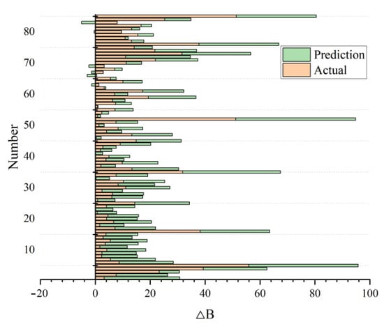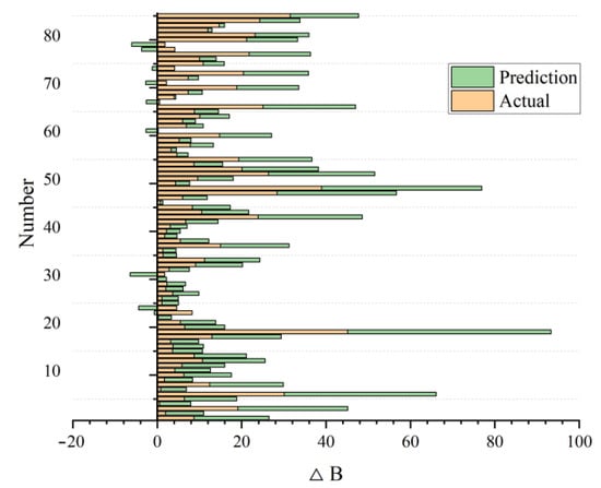 Predicted and actual values of forest biomass growth (∆B) based on the BP-ANN prediction model.