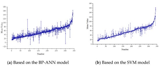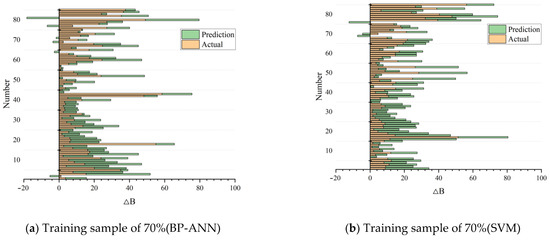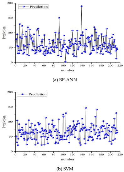In this study, we found that the prediction accuracy of the models based on the BP-ANN and SVM methods can reach more than 80%. As can be seen from Table 2 and Table 3, when the training samples of the BP-ANN and SVM prediction models included 80% of the data, the results of multiple runs fluctuated differently and the influence on the accuracy was different. Therefore, in order to further compare the stability of the two prediction models with different training samples, we reduced the number of training samples to determine the impact of the number of training samples on each model. Because the training samples generally contain more than 50% of the data, in order to highlight the comparison between research and construction models, we selected numbers of samples with an interval of 10% for training, and we obtained the model prediction fitting results when the number of training samples was 70% (Figure 11).