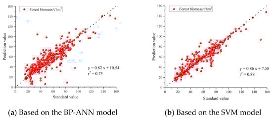 In order to express the predictive performance of the two models more intuitively, the established models were used to predict all data. After plotting the predicted values and standard values on the same coordinate system (Figure 9) and the error graphs of two models (Figure 10), we can observe the distribution of the scatterplot to compare the differences and correlations between the predicted values and standard values. Overall, the scatterplot showed that the points are dense and concentrated near a straight line, indicating relatively accurate predictions. In addition, some points were relatively scattered, which may be due to additional factors. In this case, we can continue to analyze these outliers to understand their relationship with other factors. Compared to the sub-models, the predictions of the SVM model were more concentrated near the straight line than those of the BP-ANN model (R2SVM > R2BP-ANN), indicating higher accuracy. These results indicate a strong correlation between predicted and standard values, demonstrating that the model can provide a valuable reference for forest resource management and carbon cycle research.